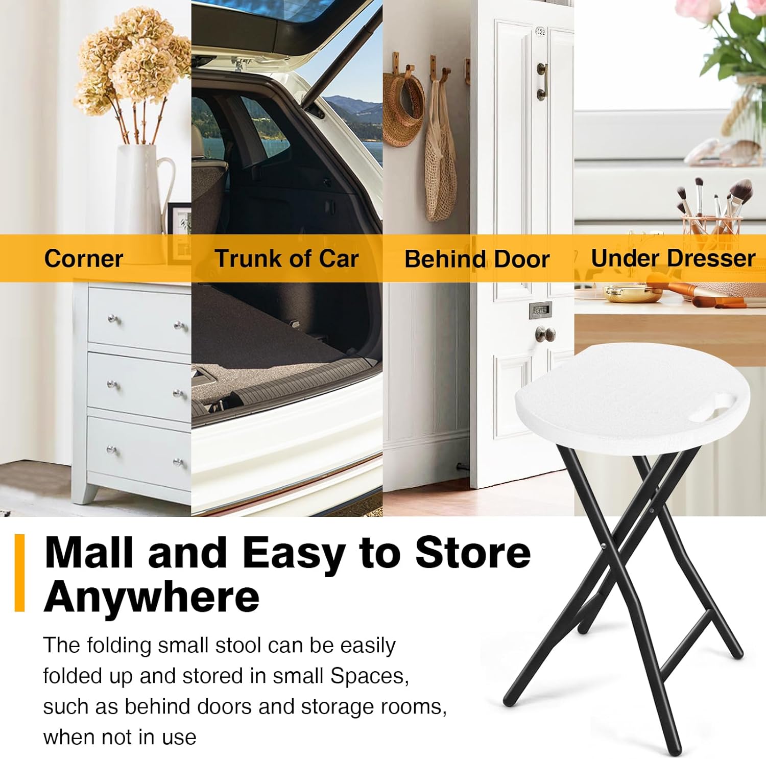 - Easy to Clean and Store - The folding stool is made of UV protected high-density polyethylene plastic with All-Weather Finish and easy to clean. The folding small stool can be easily folded up and stored in small Spaces, such as behind doors and storage rooms, when not in use.