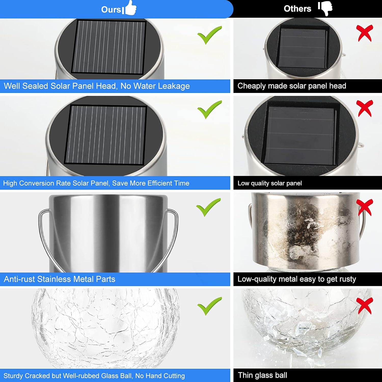 - 【Gorgeous Decoration Lighting & Great Gift】-With an eye-catching crackled glass ball cover, outdoor solar hanging lights will emit amazing glow and delivery comfortable illumination to your house, make your place look romantic and wonderful. Perfect decoration lighting for garden, patio, yard, fence, balcony, path, tree branch, umbrella, outdoor decoration party or daily life. Also an Ideal gift for your family and friends on anniversary, Birthday home warming, or other events and festivals.