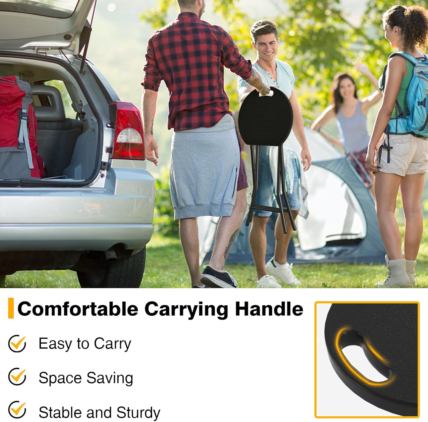 - Stable X Shaped Structure - The seat height of the portable stool is 18 inches, which is a comfortable seat height for most use cases. The legs with a stable X-shaped structure, so you don't have to worry about shaking during use. At the same time, folding stool chair has an integrated foot rest, it will not leave your feet nowhere to rest, you can put your feet on the top for greater comfort.