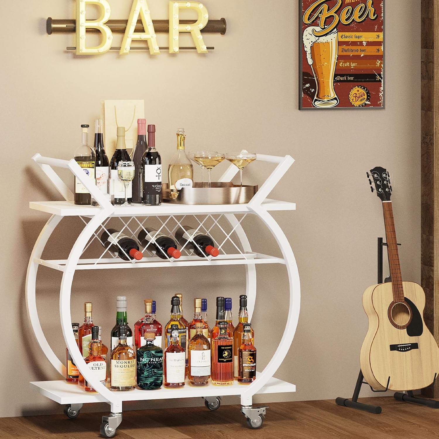 - Durable, Stable and Practical: Eco-friendly MDF and high quality metal frame ensure this farmhouse bar cart durability and stability, and it features a clean-lined frame equipped with two handles that can hang towels and control the portable kitchen cart easily.