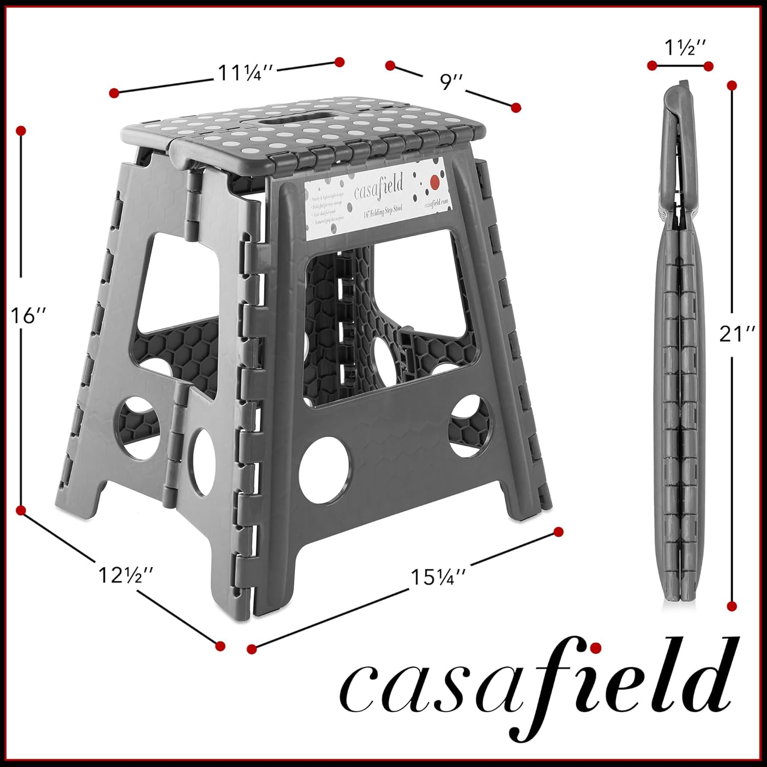 - Textured, grip-dot surface: The unique design of Casafield's folding step stool includes a stylish and textured, grip-dot, no-slip step surface, making this stool safe to use for adults. The step surface measures 11.25" W x 9" D, providing plenty of footing space.