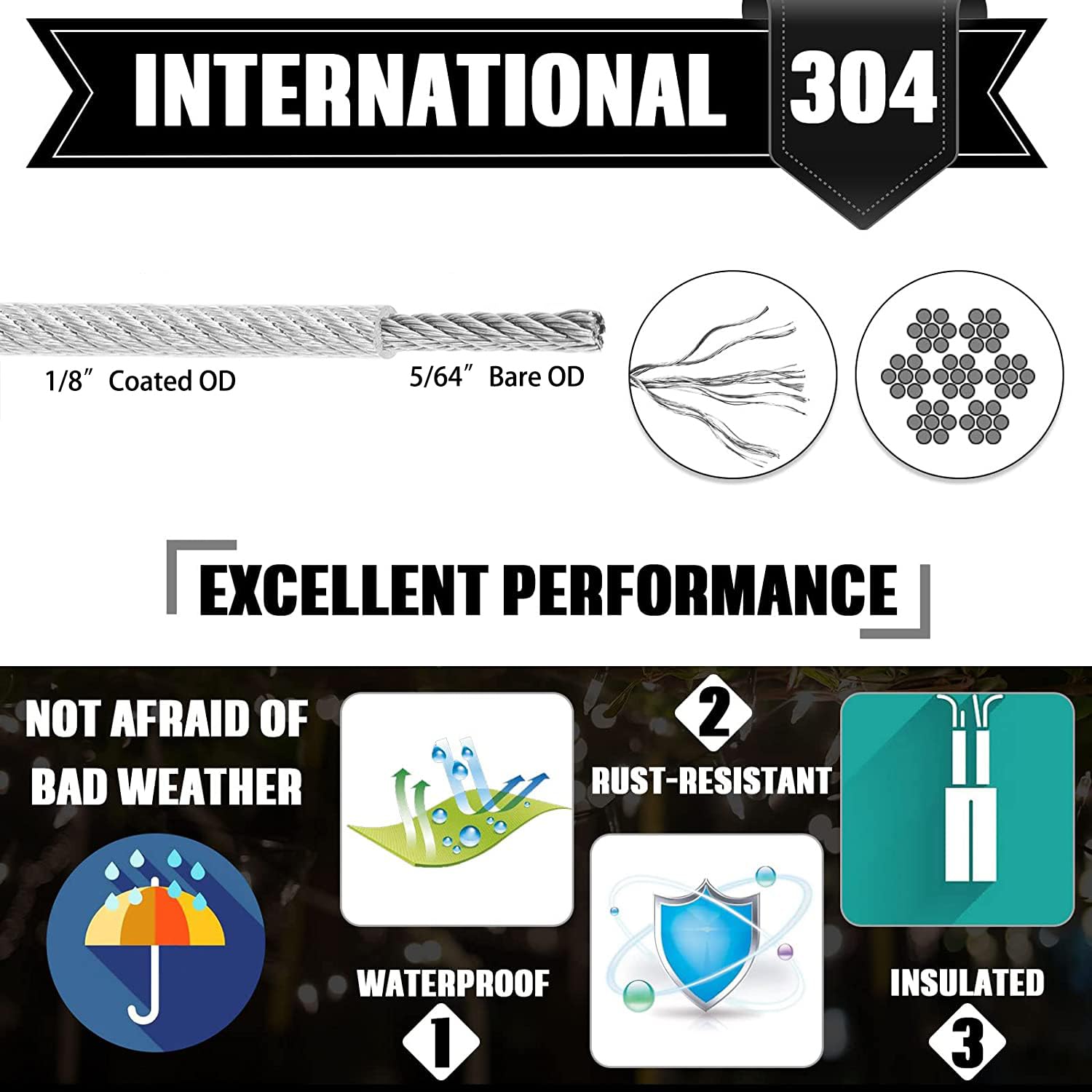 - 【1/8" Stainless Steel Wire Rope】 :application suitable for shade sail hardware, curtain wire hanging system,globe lights hanging, patio lights hanging garden , hang pictures ,outdoor applications of tent rope, clotheslines, hanging outdoor lights, deck cable railing and etc.