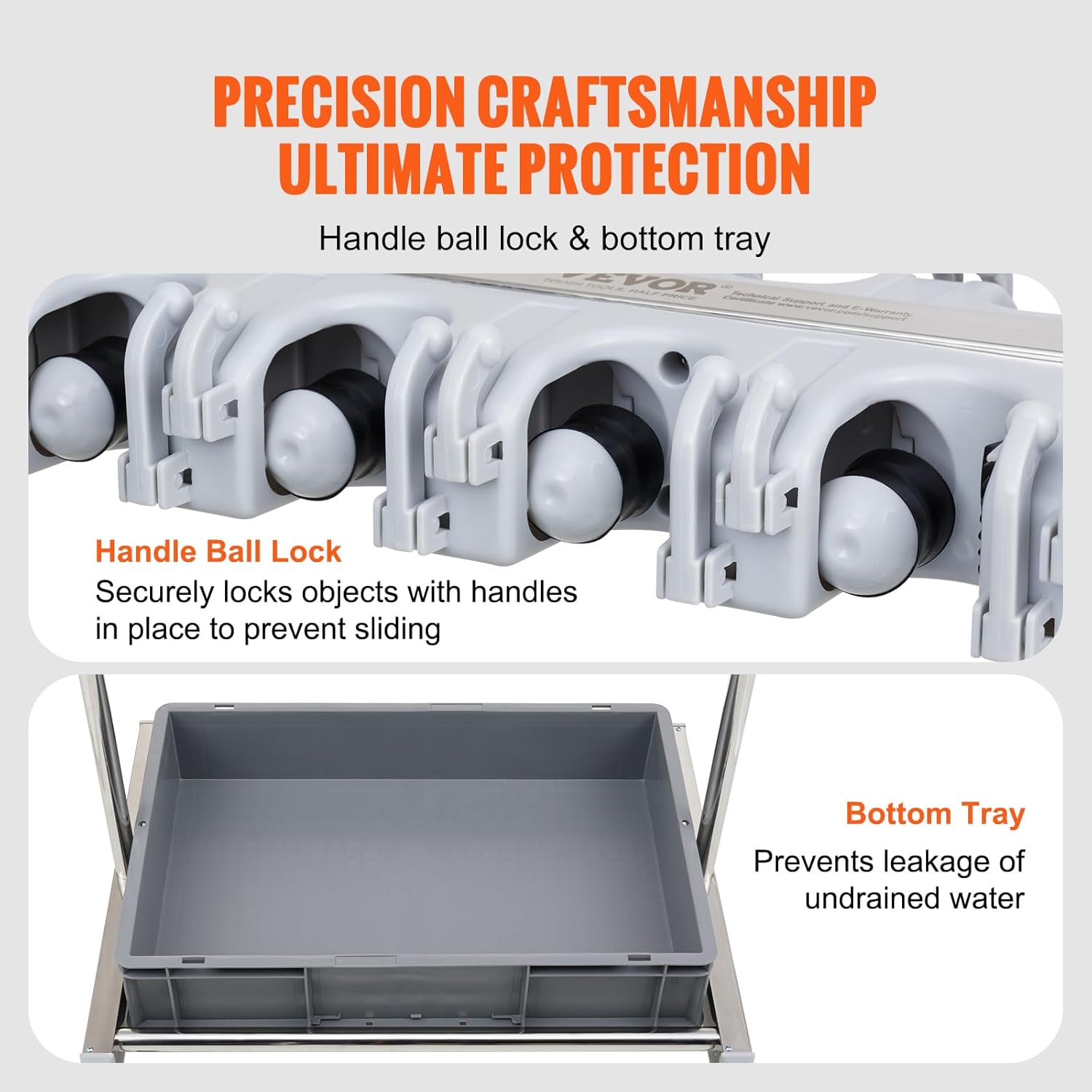 - Convenience at Its Best: The lawn tool organizer comes with 4 swivel wheels (2 of them with brakes) for easy movement between spots. It's got your back with a handy PP tray at the bottom that stops wet mops from dripping and keeps your floor squeaky clean.