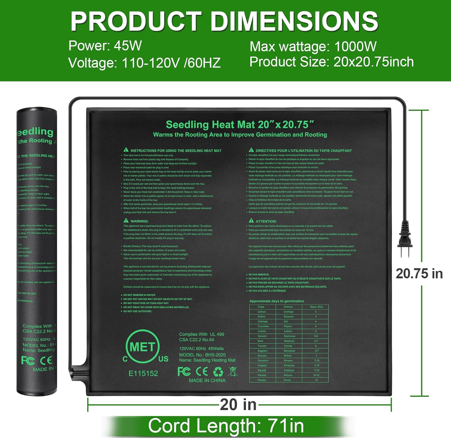 - ✿【Spec.】 Bestio seed heating mat, 110V-120V 60Hz 45W, 20X20.75". perfect for seeding, germination, home-brewing, and pet enclosures terrariums, such as those used in reptile, rodent and arachnid.