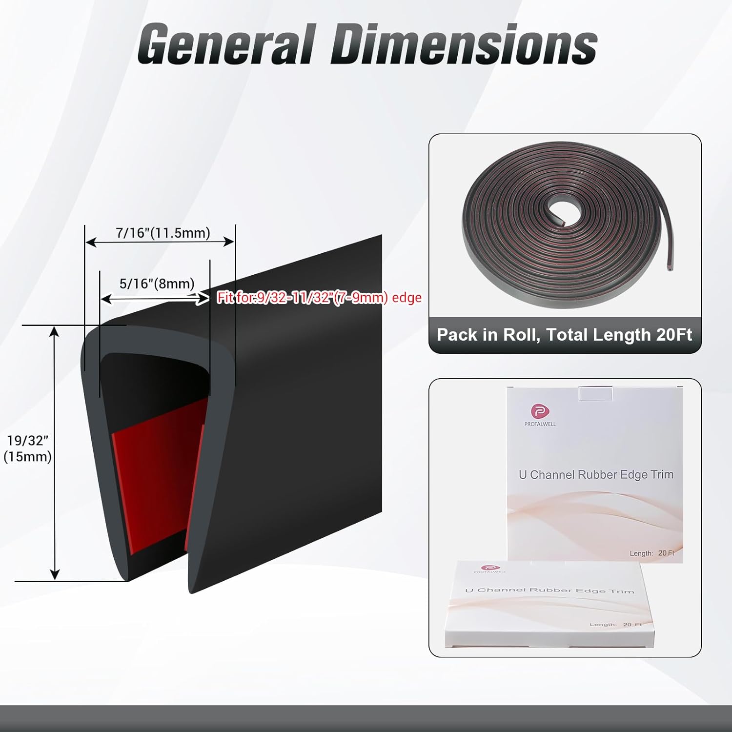 Rubber Edge Trim, Self Adhesive U Channel Edge Trim, U Shaped Trim for Plywood, Glasses, Mirror, Flexiglass, Sharp Edge Parts, Fit for 5/16", Length 20Ft, Black Color, Peel and Stick Plastic Trims