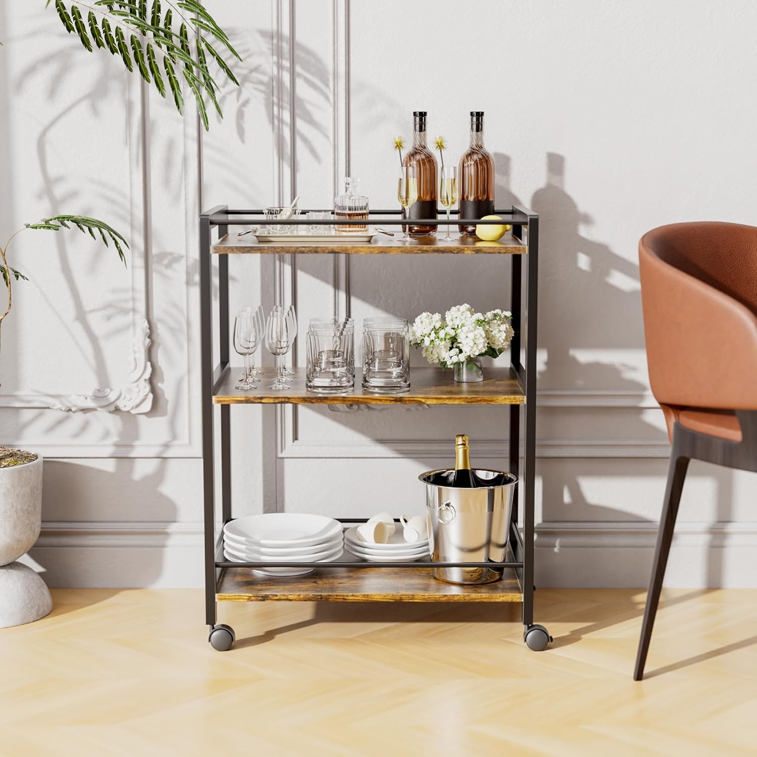 - 360° MOVABLE CASTERS - The rolling bar cart features 4 noiseless swivel wheels, 2 of which are lockable, allowing it to move freely and easily roll anywhere or stay in place. Increase flexibility and safety for daily use