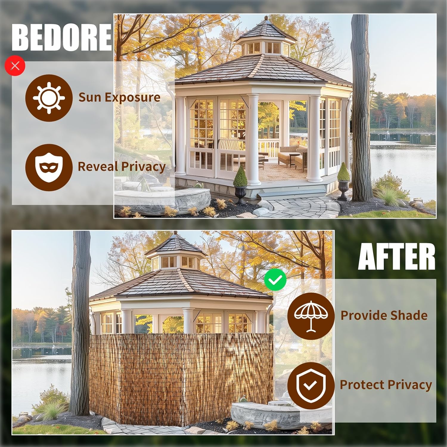 - Use:Use as a fence, sunshade, suitable for patios, balconies, offices, decks, sunrooms, cafes, gazebos, garages, galleries, pool decorations, or put it on the exterior wall of the house for insulation purposes. A perfect environmentally friendly alternative to other wood products. Commercial and residential indoor or outdoor environments.