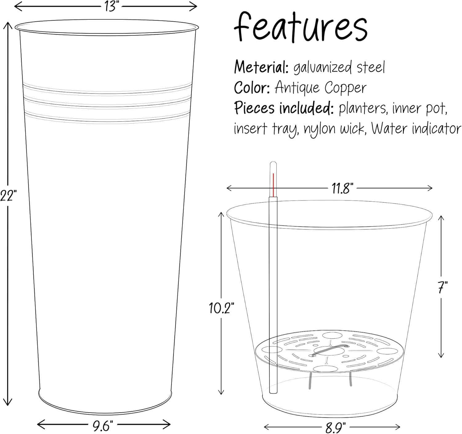 - INSERT POTS: Package includes 2 large planters and each planter comes with a steel insert pot to reduce the amount of soil needed to fill the containers. Each insert has a drainage plate to ensure that the plant roots have sufficient ventilation and respiration. And each insert has a cotton absorbent rope, which can prevent plant roots from rotting by absorbing excess water