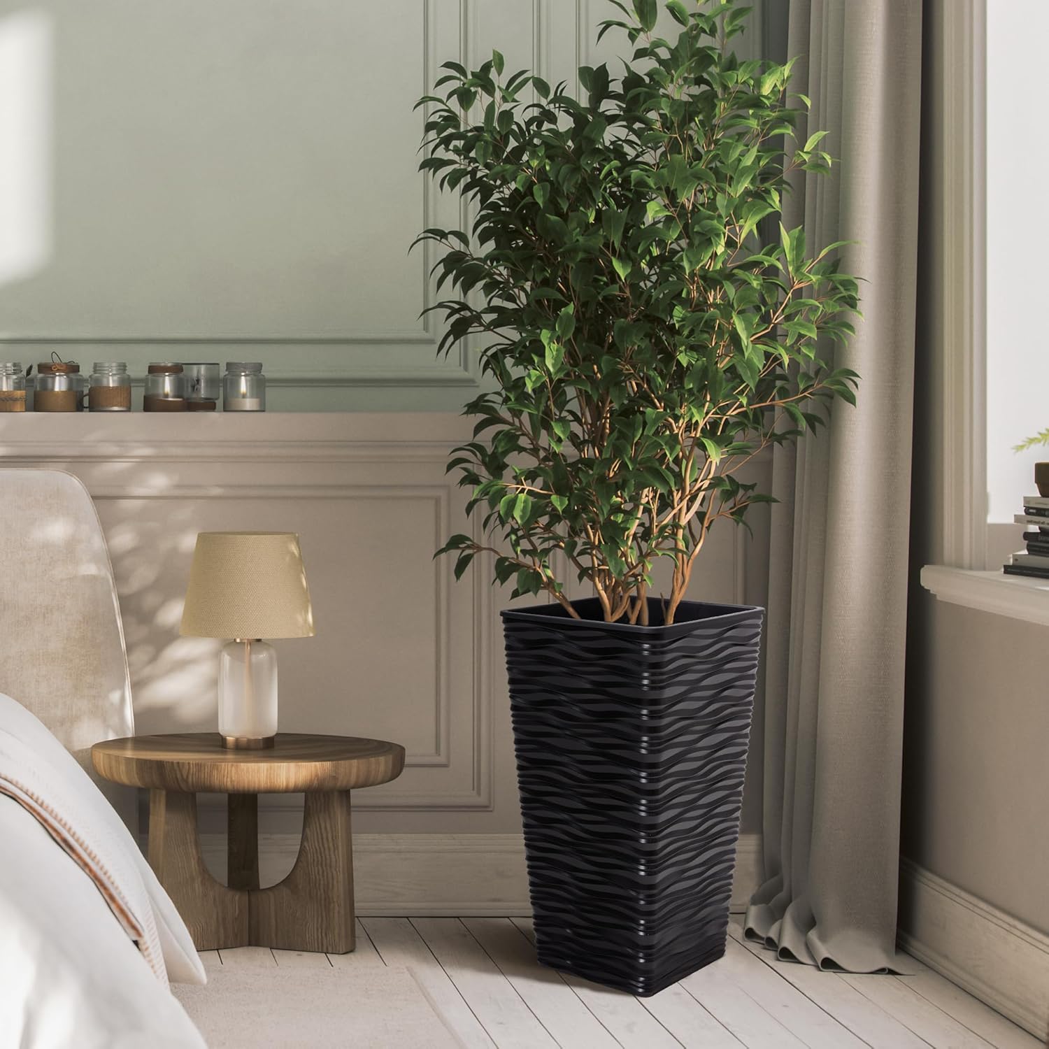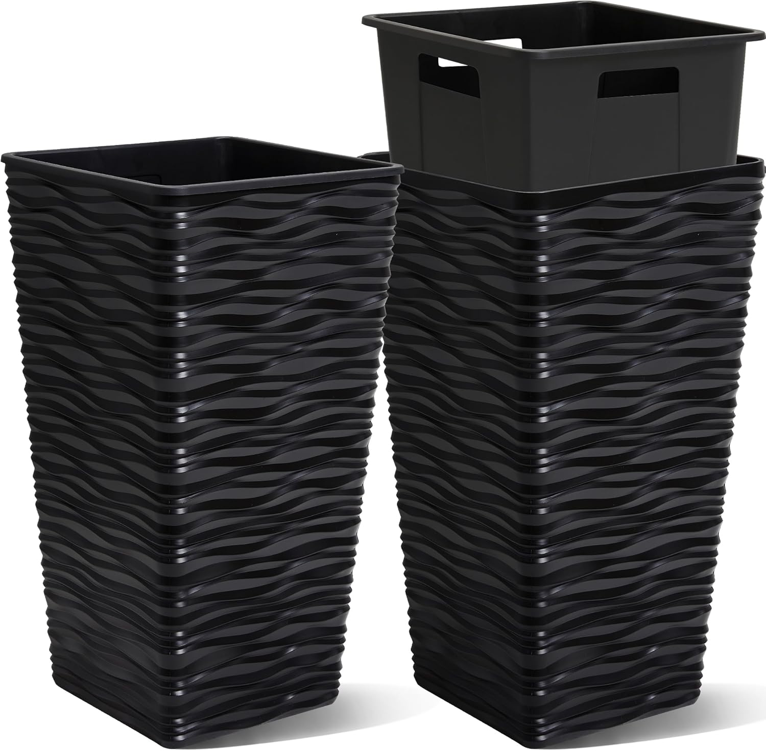 Worth Garden 2-Pack 22" H. Black Square Tapered Planter with Inside Pots - Plastic Plant Pots for Indoor Outdoor - Modern Wavy Finish Decorative Flower Pots for Front Porch Containers Patio Deck