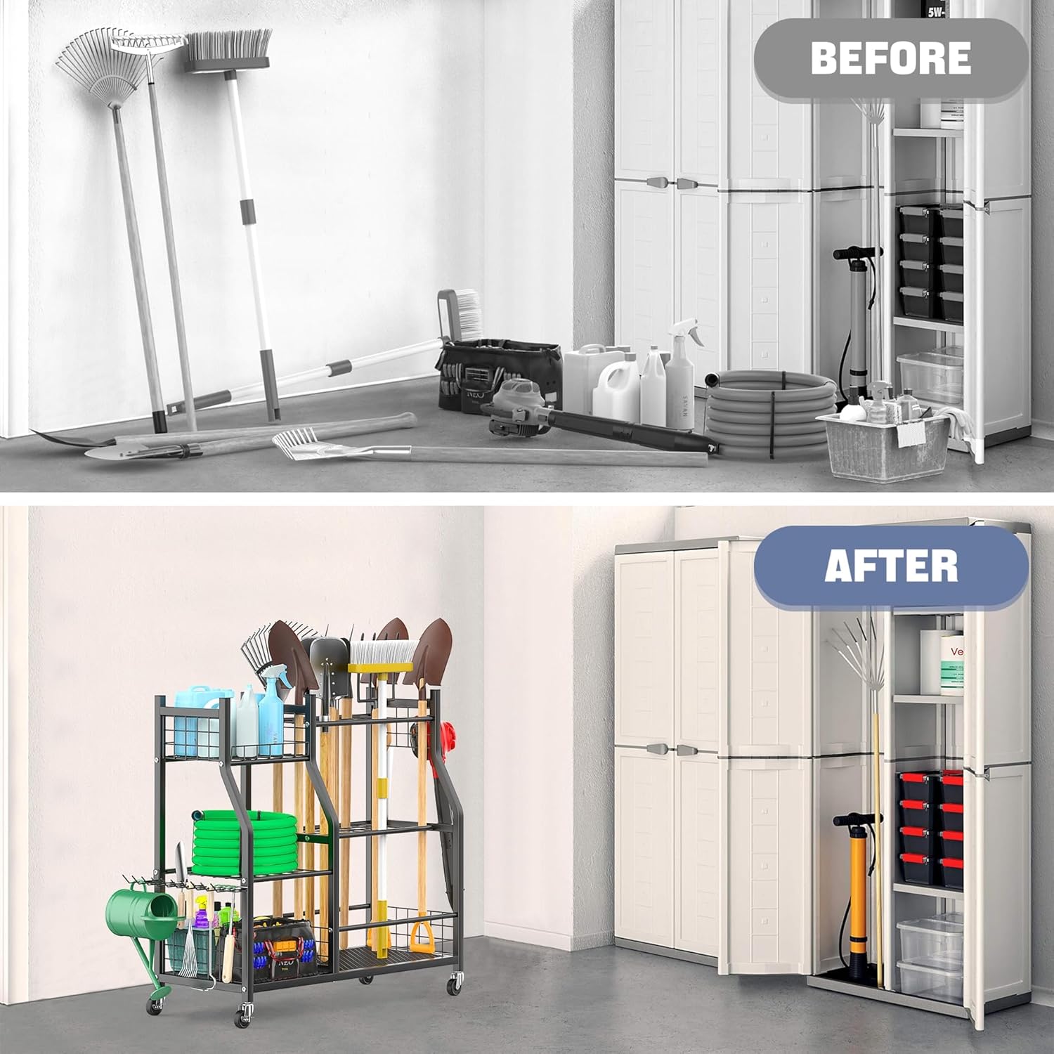 - Portable Design with Wheels: Easily move garden tools around your yard or garage with this wheeled organizer. Ideal for solid floors, the wheels offer flexibility that wall-mounted racks lack, allowing you to roll the cart close to your work area or outside