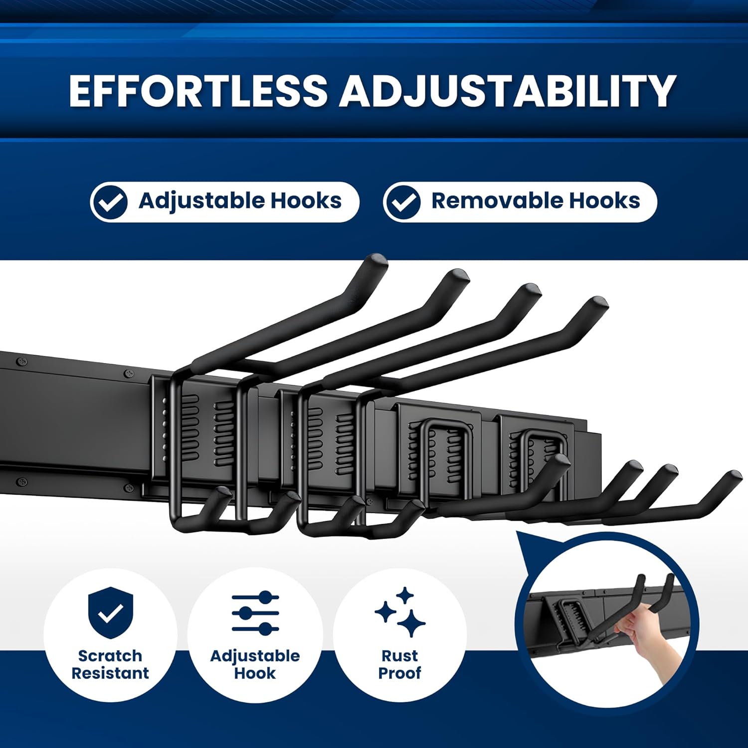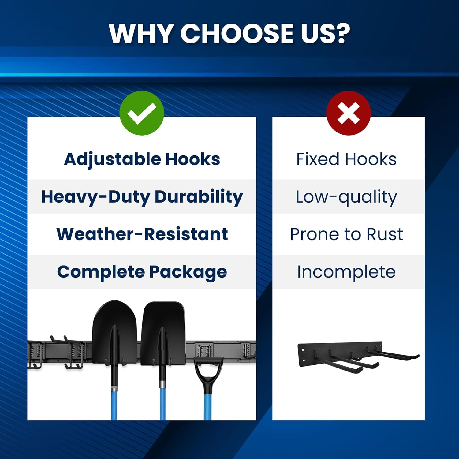 - Customizable Tool Organizer: Equipped with 4 hooks(2 tool hooks, 2 double-layer hooks) and 2 rails, this garden tool organizer allows you to tailor your setup to meet your specific needs.