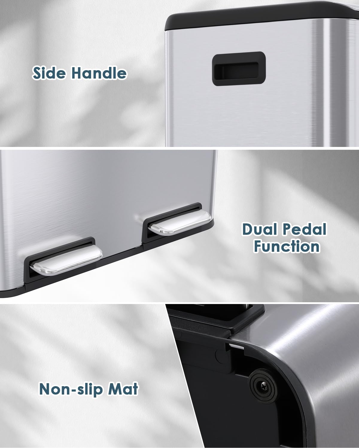 - Sealing Base&Soft Close: Recycling bin uses sealing base, which is effectively pet-proof and waterproof. And anti-slip rubber pads can prevent trash can from toppling over. Once your foot leaves the pedal,trash can lid will drop down automatically and quietly. Slow-closing lid design prevents sudden banging noises.