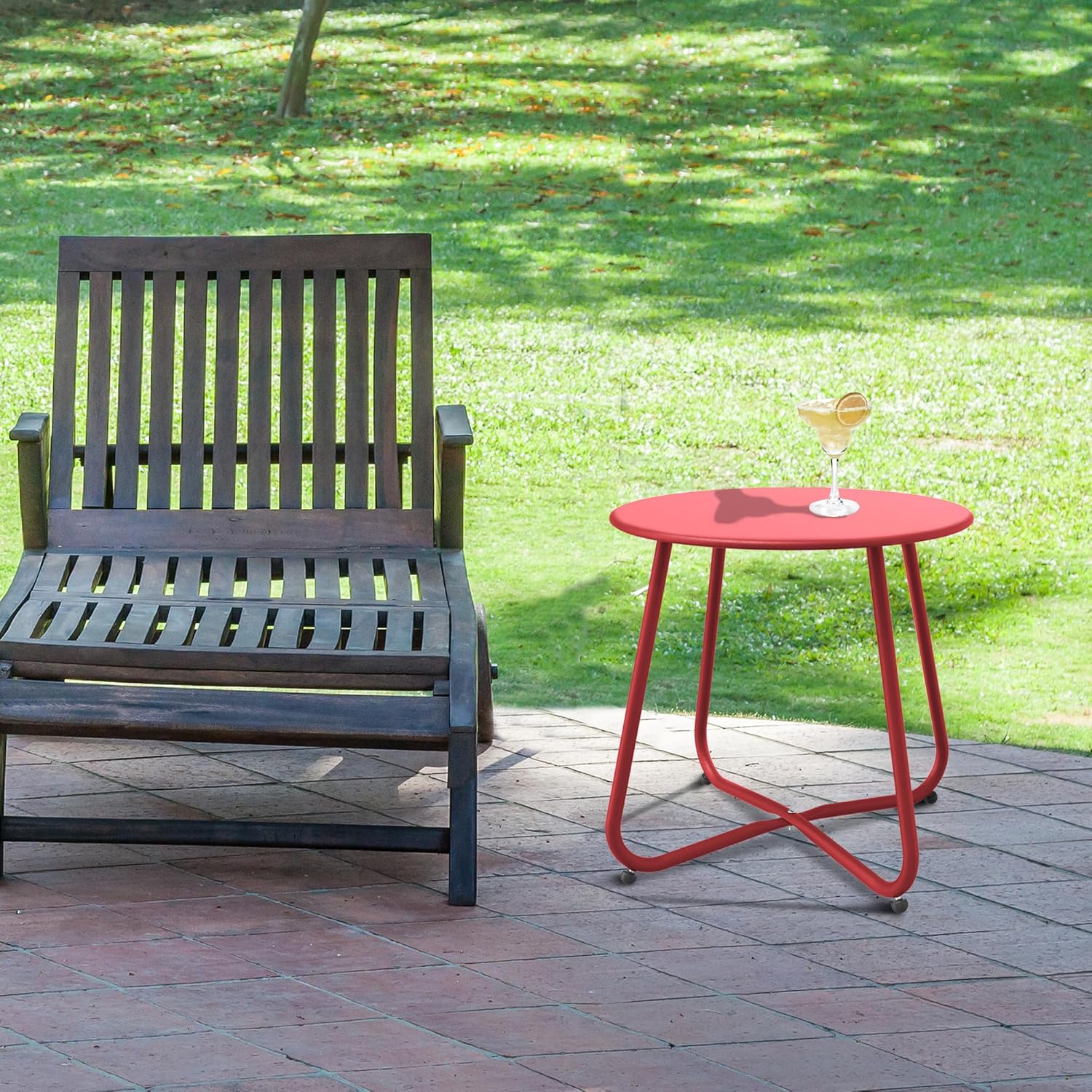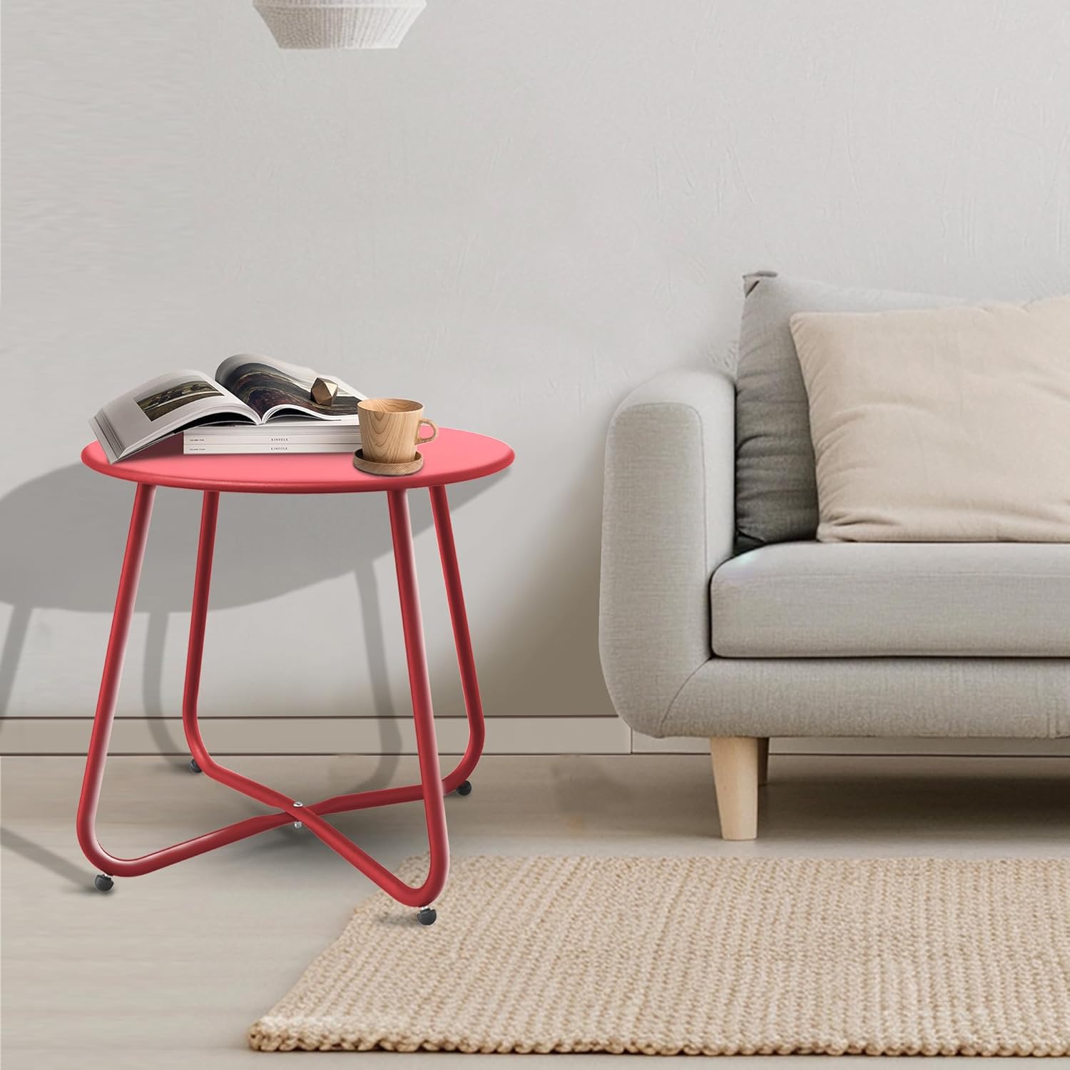 Patio Side Table Waterproof Round Metal Steel Weather Resistant Portable Outdoor and Indoor End Table for Garden Balcony Yard, Dark Red