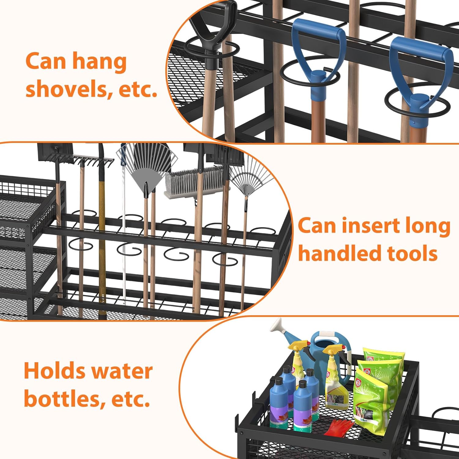 - 【Wide Range of Application】 This garden tool organizer ideal for garages, gardens, sheds, and backyards. Custom-built to store gardening, yard, cleaning, and lawn tools, it easily accommodates items like shovels, rakes farm tools, lawn tool, and also cleaning supplies like mops, brooms.