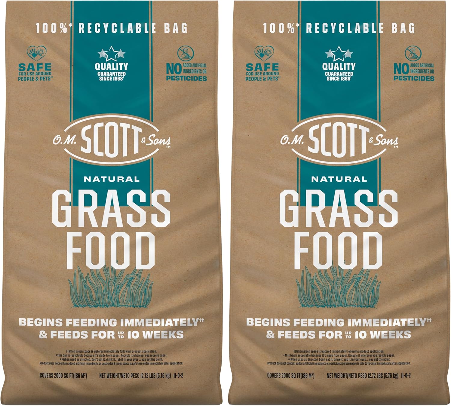 - This bundle comes with two bags of O.M. Scott & Sons Natural Grass Food; each 12.72 lb. bag covers 2,000 sq. ft.