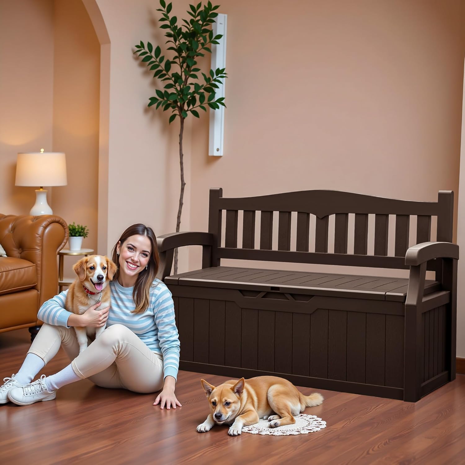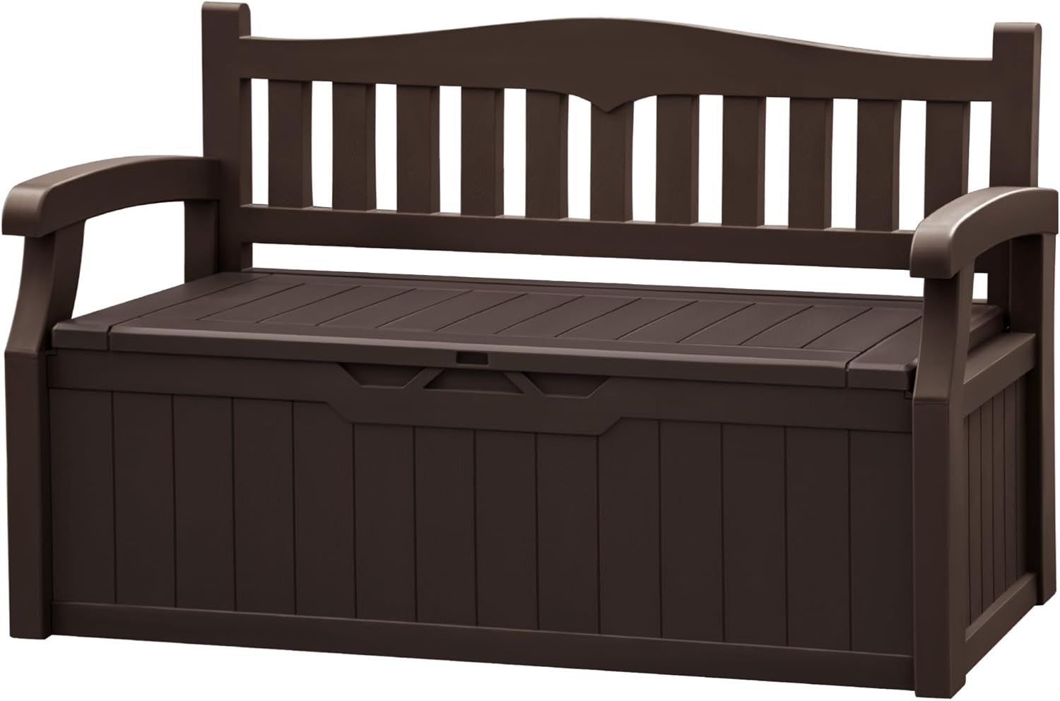 JUMMICO 80 Gallon Resin Outdoor Storage Bench, Large Deck Box with Armrest, Lockable & Waterproof for Garden, Home, Patio, Pools (Brown)