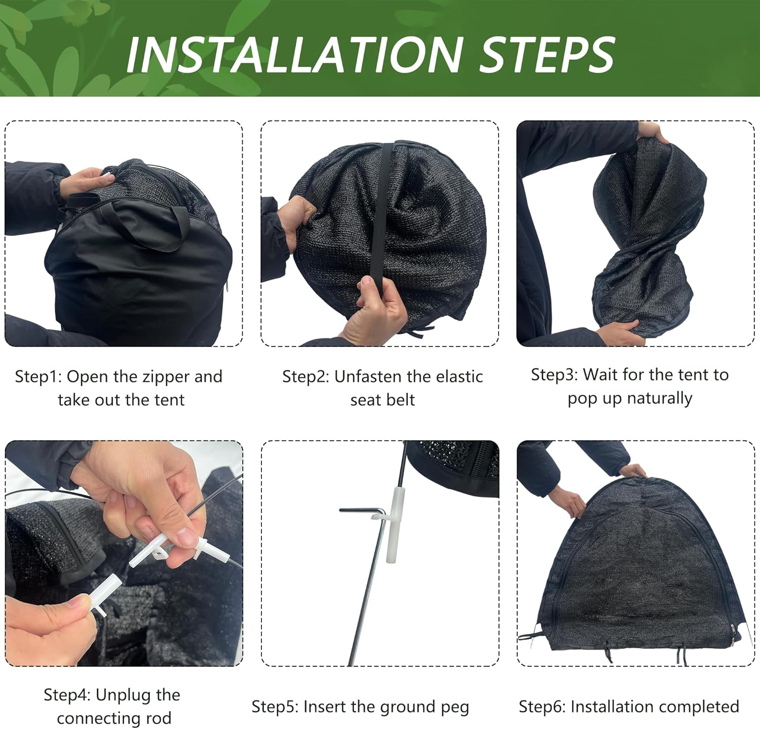 - Unique Design: UV resisitant plant cover tent adopts pop-up design, easy to assemble and use, and more stable and safe to insert the stakes into the ground. The garden shade tent is designed with double zippers on one side, which is convenient for moving potted plants, pruning branches and leaves, picking fruits and so on.
