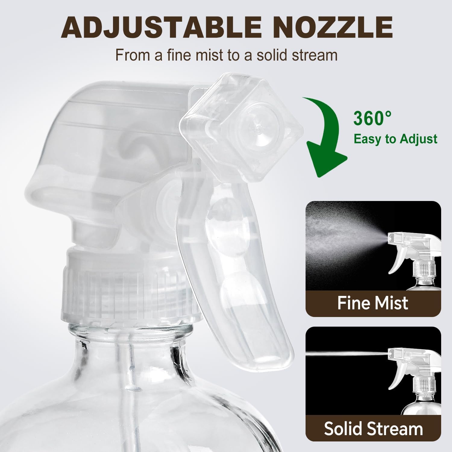 - 3 Modes (Fine Mist, Solid Stream & Turn Off) - Easy to hold and spray, these sprayer bottles feature a smooth nozzle adjustment for mist to stream. They deliver a gentle mist that won't harm delicate plants and a solid stream up to 10 feet, catering to different scenarios.