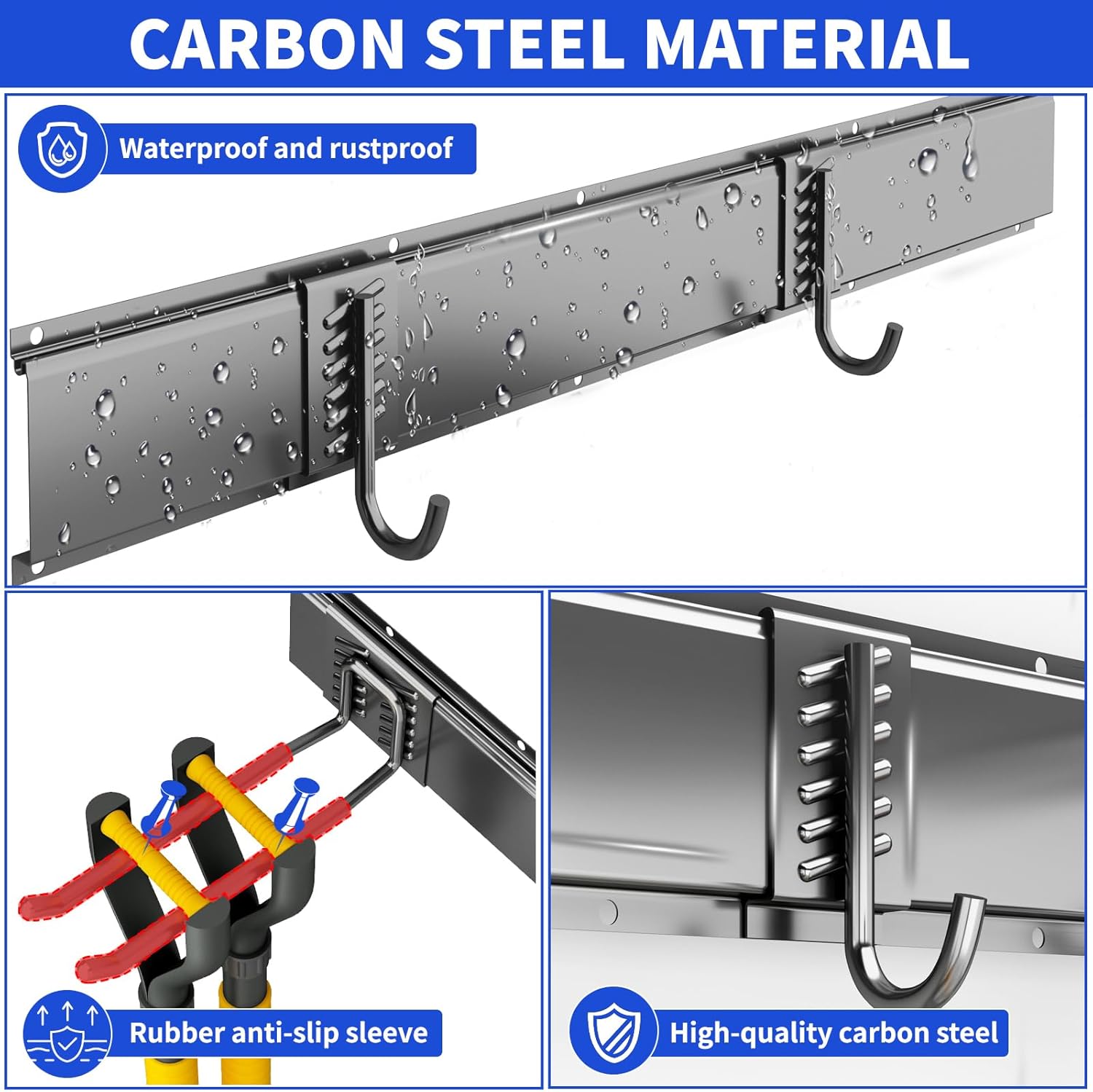 - HEAVY-DUTY 300 LBS CAPACITY: garage organizers and storage Constructed from premium steel with a rust-resistant, double powder-coated finish. Rubber-coated hooks prevent slipping. Built for long-lasting durability in your garage or garden