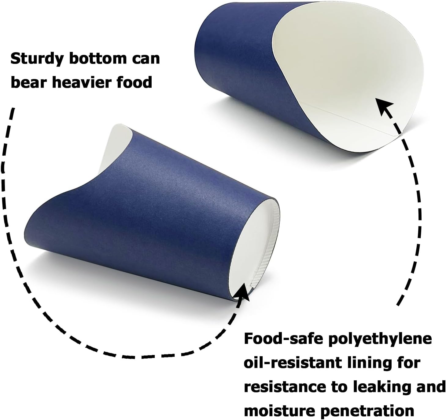 - [Resistance to Moisture Leakage and Penetration] - Each of navy paper cups holder has food-safe oil-resistant lining for resistance to leaking and moisture penetration. Giving your customer or friends a delightful food cups packed with delicious without any greasy mess or embarrassing stains!