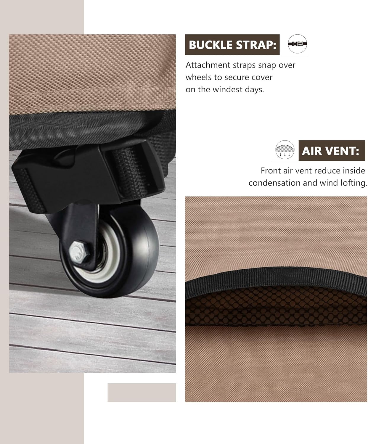 - Well-made structured air vents keep ventilation, prevent the cover from being blown away, also keep your grill equipment dry and in good condition.