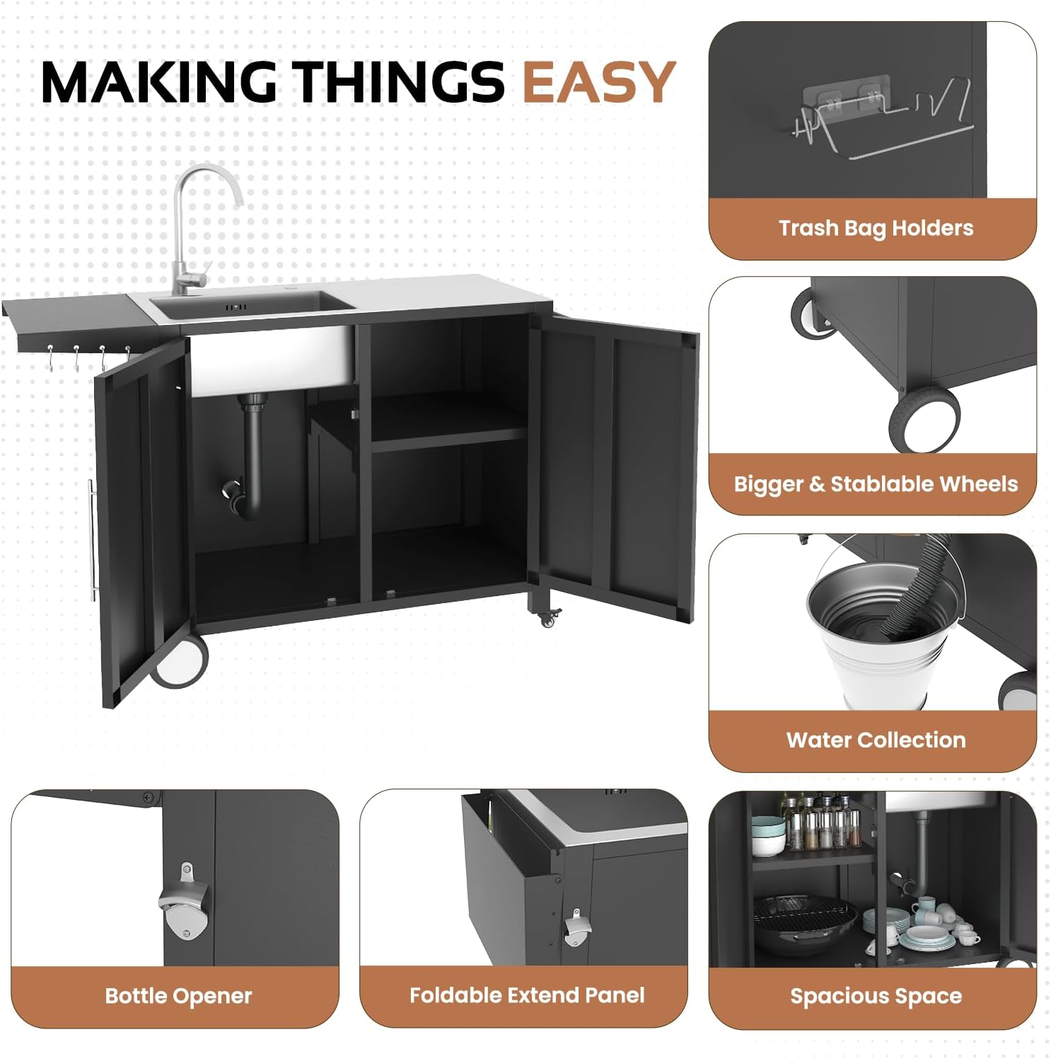 - 【Smart Multi-Functional Workspace】Expand your outdoor kitchen capabilities with a 38"-54" adjustable workstation featuring prep surfaces and dedicated zones for grilling tools The integrated 7.7'' deep basin sink with debris filter pairs with 60+ gallon enclosed storage, 4 utensil hooks, trash bag holder, integrated bottle opener and paper towel rack for complete BBQ organization.